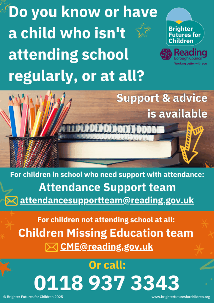 If a parent or member of the public is concerned a child is not going to school, or does not have a school place, they can contact the Children Missing Education team for support, advice and guidance by emailing cme@reading.gov.uk or calling 0118 937 3343.